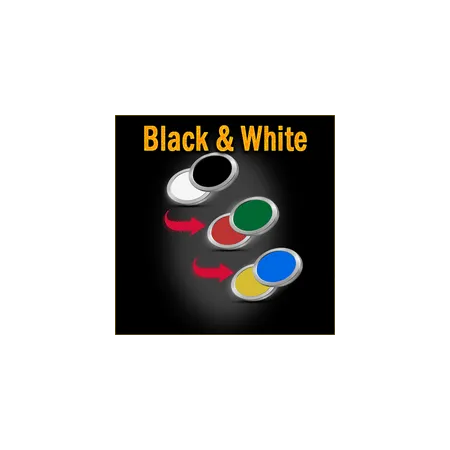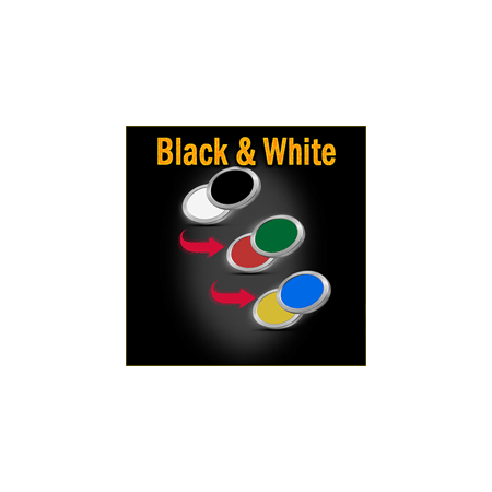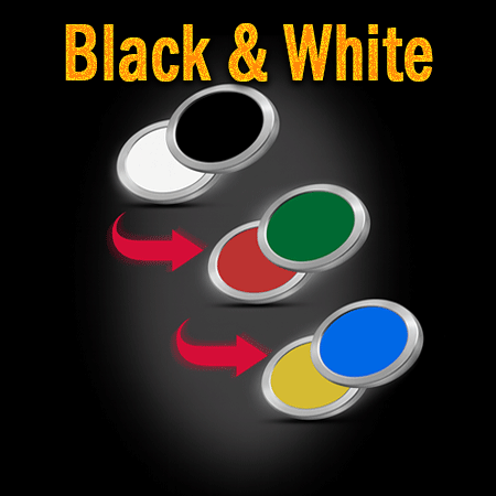 Par simple contact deux jetons noir et blanc changent miraculeusement de couleur pour se transformer en jeton vert et bleu et en jeton jaune et rouge.