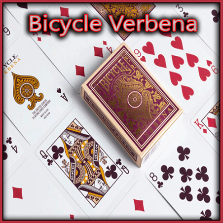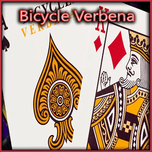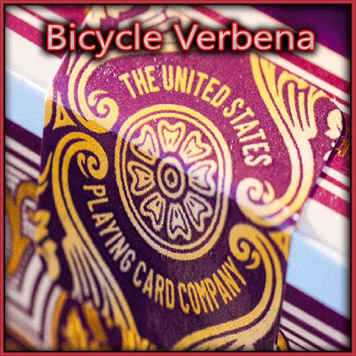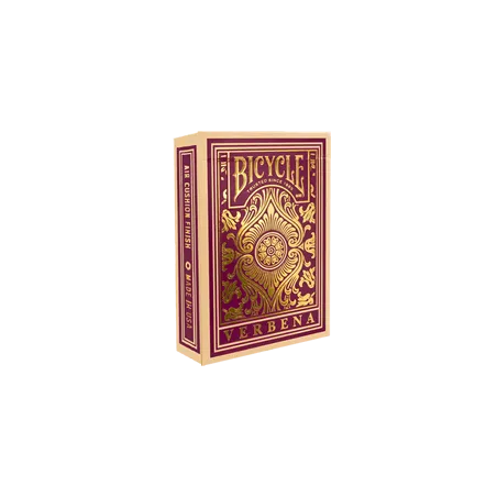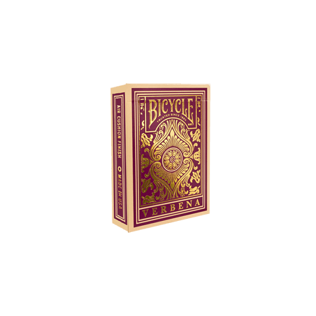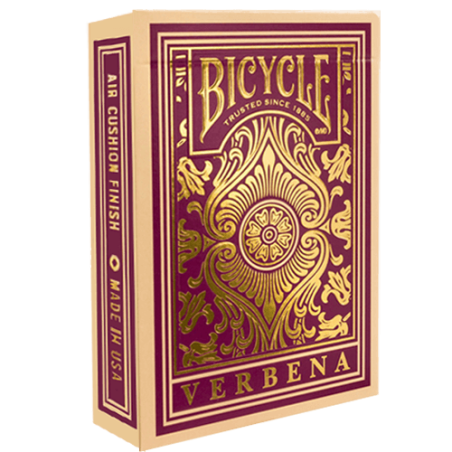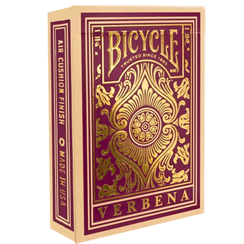 Bicycle Verbena s'inspire de la fleur sauvage, avec un design aux lignes complexes de tiges et de fleurs, souvent vues dans des tons de violet foncé. La feuille dorée sur le tuck représente la chaleur du soleil. Le design tde l'étui rappelle les forces divines et surnaturelles souvent associées à son homonyme.
