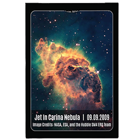 Admirez l’impressionnant Jet dans la nébuleuse de la Carène illustré au dos de chaque carte, grâce à une photographie exceptionnelle capturée par le télescope spatial Hubble le 13 avril 2022.