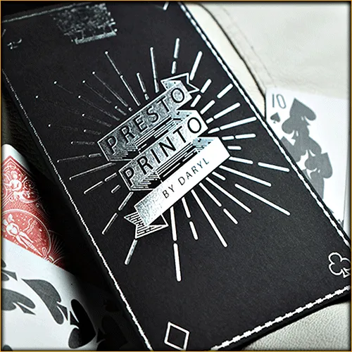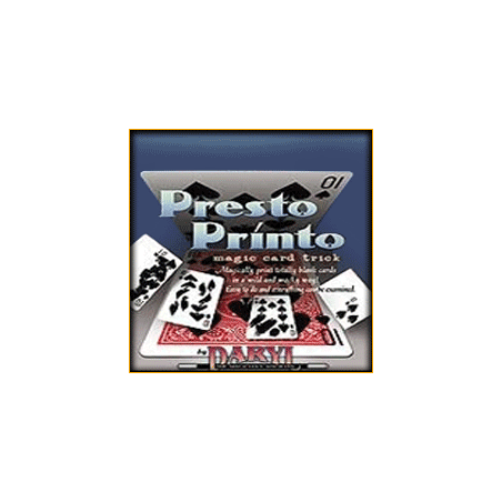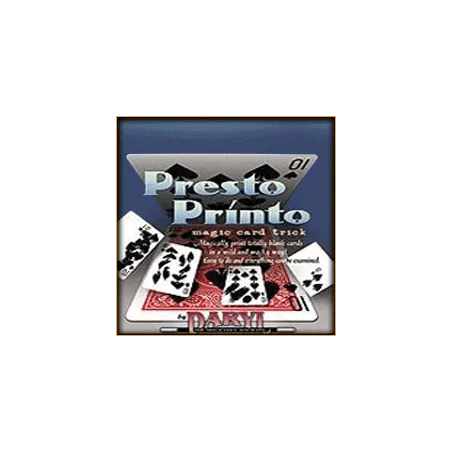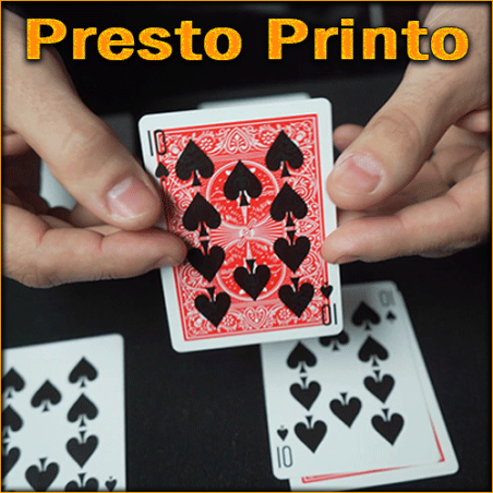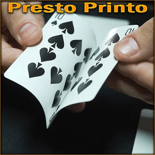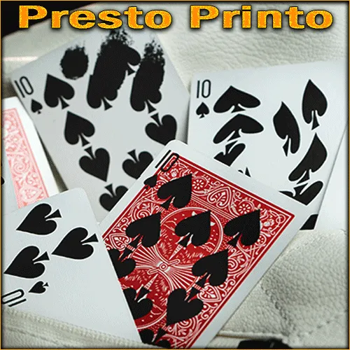 Difficile de réaliser plus vite l'impression de cartes à jouer ! « Presto Printo » est un effet que vous aurez plaisir à présenter tant son impact sur les spectateurs est puissant. En effet, les effets s'enchaînent sans laisser aux spectateurs le temps de souffler !!! Vous montrez aux spectateurs 9 cartes blanches, une fois côté face, une fois côté tarot, avant de les placer en deux rangées de quatre et de tendre la dernière à un spectateur. Et maintenant c'est partie...