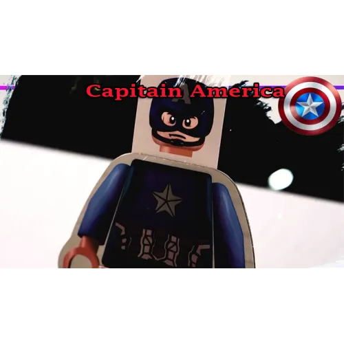 Une figurine Lego est représentée, avec son torse et ses jambes mais sans la tête. Le spectateur choisit entre différentes images de super-héros il y a que la tête représenté