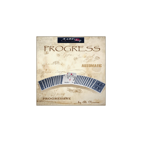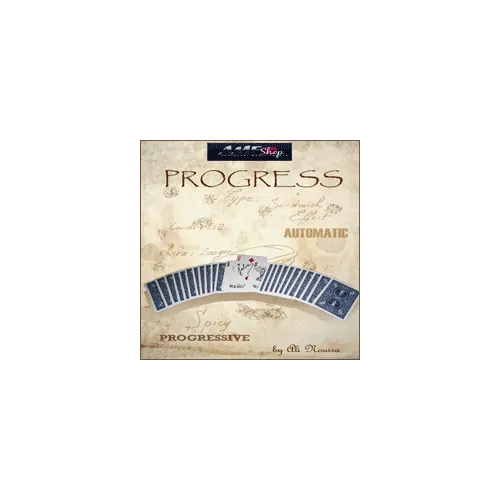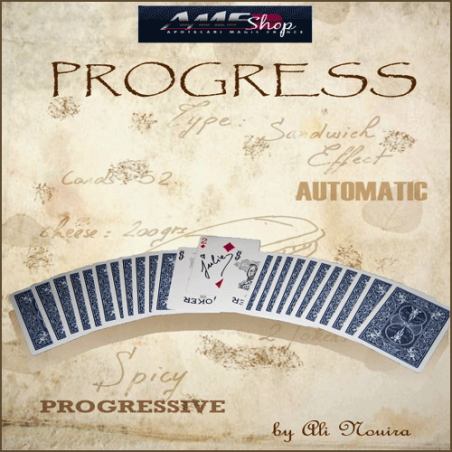 Création d'Ali Nouira, Progress présente une routine de sandwich inédite et visuelle. Deux jokers, manipulés de manière progressive, encadrent la carte signée du spectateur. Facile à exécuter, ce tour interactif permet au spectateur d'étaler les cartes, ajoutant une dimension participative à l'effet magique.